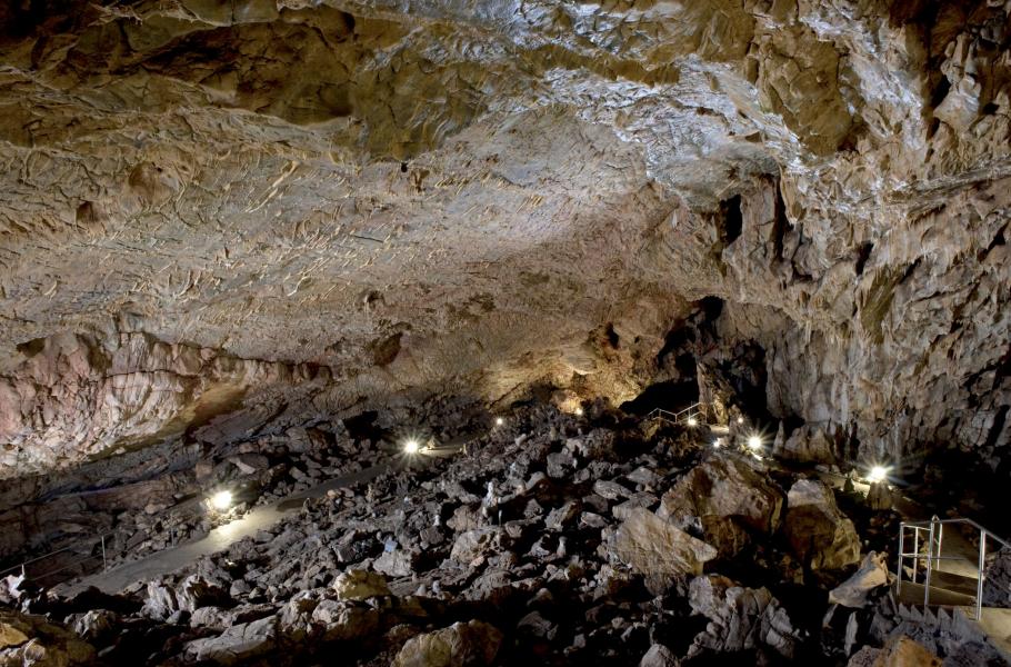 Prohlídka jeskyně začíná v mohutném vstupním portálu. Odtud pak šedesát metrů dlouhou nízkou chodbou vede do největší veřejnosti zpřístupněné jeskynní prostory v České republice – Hlavního dómu s rozměry 97 × 44 × 20 metrů. Podzemní přírodní chrám má vynikající akustiku a je příležitostně využíván k pěveckým a hudebním koncertům. Akustika dómu je návštěvníkům demonstrována ukázkou reprodukované hudby. Z Hlavního dómu vede několik chodeb a komínů. Jedním z nich je Medvědí komín významný nálezem koster pravěkých medvědů.