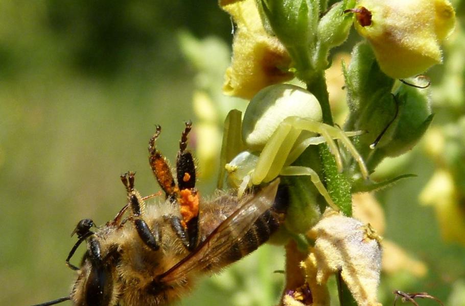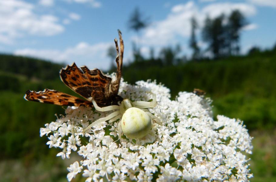 Jakmile na jaře rozkvetou bílé a žluté květy, vždy se těším na pozorování nijak vzácného, ale fascinujícího pavouka běžníka kopretinového (Misumena vatia), jehož samičky jsou skutečnými dravci hmyzího mikrosvěta.