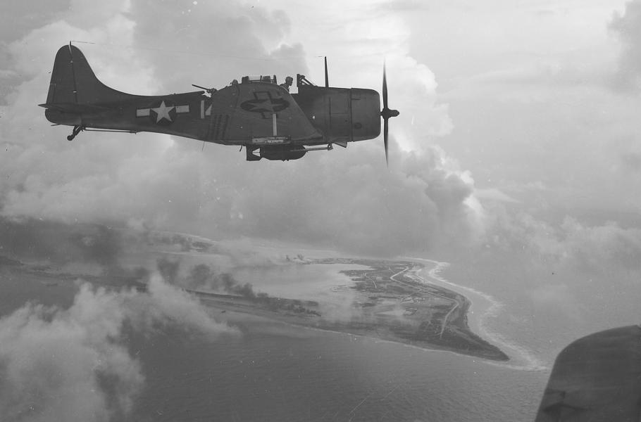 Střemhlavý bombardér SBD-5 Dauntless nad atolem Wake v říjnu 1943. (foto: Wikimedia Commons, U.S. Navy, Charles Kerlee, PDM 1.0)