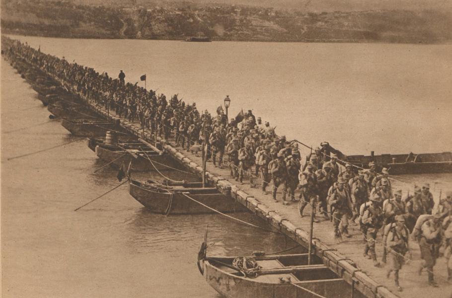 Rumunská pěchota překračuje Dunaj na provizorním pontonovém mostě. (foto: Wikimedia Commons, Gallica Digital Library, PDM 1.0)