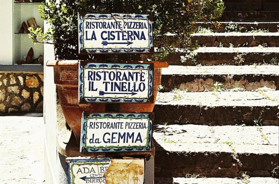 V zákrutách uliček v centru Capri se můžete toulat třeba několik hodin. Klidně zapomeňte na všechny krámky se suvenýry, kavárny či pizzerie, do nichž vás budou posílat cedule či prospekty cestovních kanceláří. Mnohem zajímavější je nahlížet přes zídky domů, procházet uličkami mezi hotely a představovat si, kdo slavný a známý v nich kdy bydlel, propadat nostalgii ošlapaných schodišť, vedoucích do zarostlých zahrad a snažit se rozluštit nápisy na zašlých pamětních deskách.