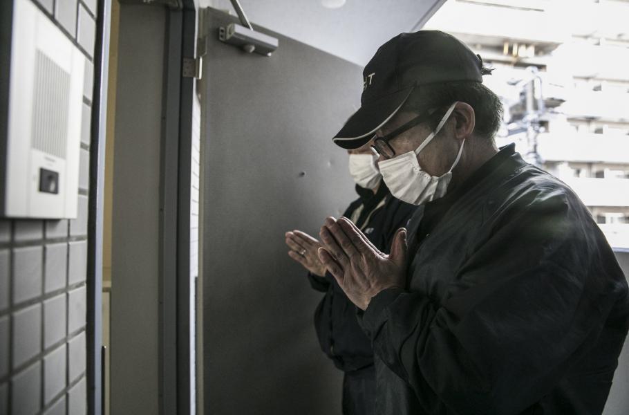 Jautaka Kimura a Akira Fudžita se modlí při očistném rituálu poté, co vyklidili garsonku po zemřelém.