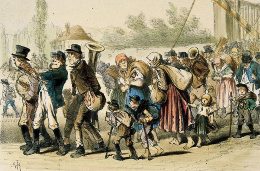 Češi jdou do Vídně, satirická kresba z roku 1869. Oděvem a chováním vyvolávali Češi v rodilých Vídeňanech dojem křupanů z venkova, kterými skutečně namnoze byli.