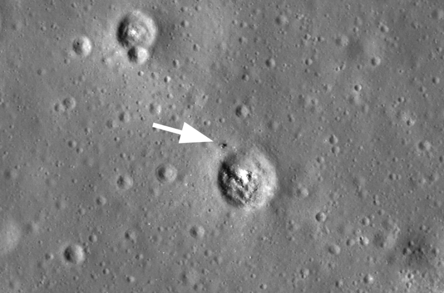 Návratový modul Luny 24 nakonec úspěšně přistál zhruba se 170 g materiálu, v němž později sovětští vědci detekovali malý obsah vody (kolem 0,1 %). Od té doby už přítomnost životodárné tekutiny na Měsíci potvrdilo více robotických výprav. Snímek zachycuje přistávací stupeň Luny 24 zanechaný na Měsíci, jak jej vyfotila americká sonda LRO.