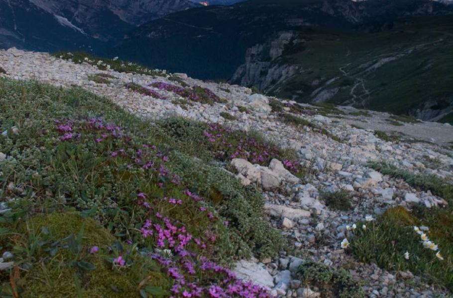 Po chvíli si vyhlížím ideální místo: v popředí fialově kvetoucí rostliny, v pozadí hora, do níž se opřou první ranní paprsky. „Už aby tady byly“, modlím se mezi jednotlivými dřepy ve snaze alespoň trochu se zahřát. Ale co to, mrak na východní straně obzoru, jediný na celé obloze, potvrzuje platnost Murphyho zákonů. Ladislav Kamarád, fenomenální český fotograf-krajinář, má pro něj speciální, stěží publikovatelné pojmenování „mrak k--vič“. Tento nebeský útvar se totiž vyznačuje tím, že ráno trůní na východě, aby se po jinak jasné obloze přesunul k večeru na západ a učinil tak ranní vstávání i večerní čekání na to nejlepší světlo zbytečným. Naštěstí se aspoň trochu fotografický bůh smiloval, a tak si posléze můžeme navzájem sdělit dojmy z prvních dolomitských vyhlídek.