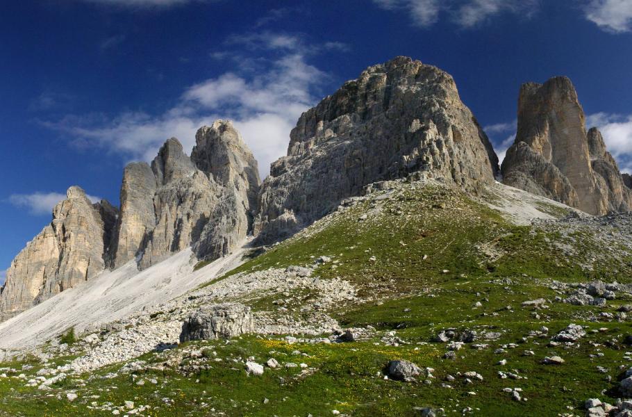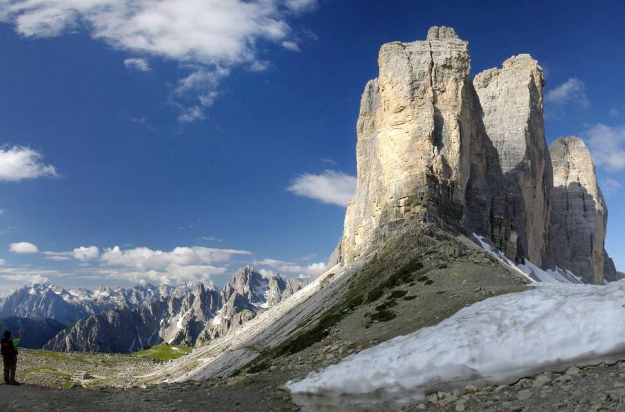 Kousek za sedlem (2 454 m n. m.) se konečně otvírá typický pohled na Tre Cime. Skalní zuby, které do první světové války tvořily hranici mezi Rakouskem a Itálií, měří 2 999 (Cime Grande), 2 973 (Cime Ovest) a 2 857 (Cime Piccola) metrů. Poválečné uspořádání přiřklo celé území Itálii, avšak zůstaly zde početné německé menšiny i jména (po německy tedy Drei Zinnen). Slavné via ferraty, zajištěné cesty, umožňující i nehorolezcům vystoupat na některé z vrcholků, mají (jako ostatně spousta jiných věcí) svůj původ ve válečném běsnění, které se nevyhnulo ani zdejším horám. Tunely a žebříky usnadňovaly vojákům pohyb v těžkém terénu, dnes slouží bohulibějším účelům.