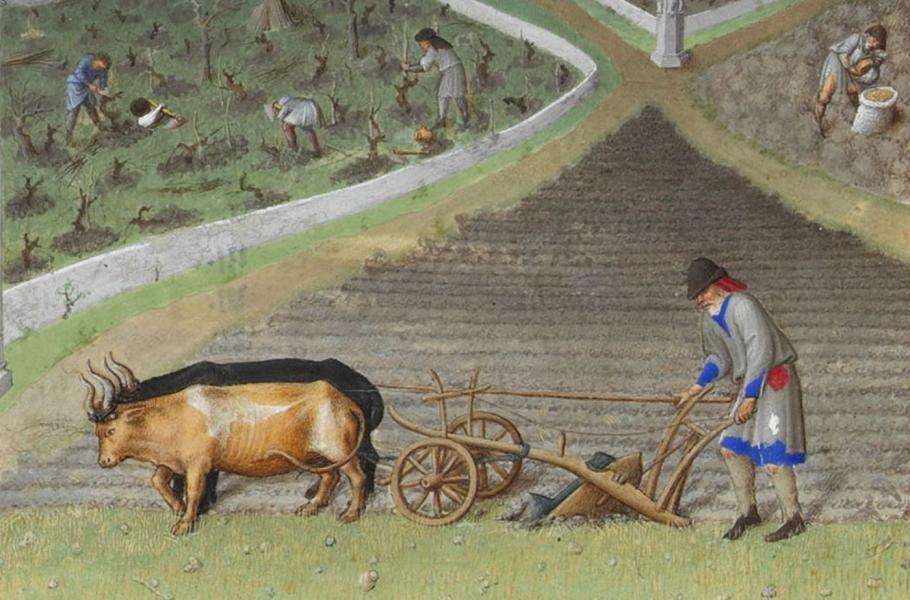 Jarní orba a další zemědělské práce v Přebohatých hodinkách vévody z Berry z konce 15. století. (ilustrace: Wikimedia Commons, CC0)