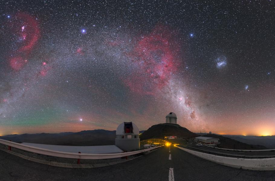 Nad observatoří ESO La Silla v Chile se velkolepě zjevují gigantické oblasti zářícího vodíku HII. Vlevo od středu snímku se rozkládá komplex mlhovin v Orionu (oproti tomu, jak jej známe na severní polokouli, je vzhůru nohama). Vpravo pak přitahuje pozornost velká mlhovina Gum 12. (foto: © Petr Horálek)