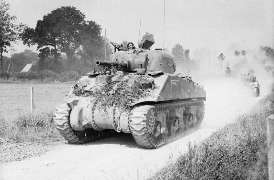 Tanky Sherman postupují v srpnu 1944 Normandií. Tou dobou tam v jednom z nich bojoval i Abrams. (foto: Wikimedia Commons, Imperial War Museums, IWM Non Commercial Licence)