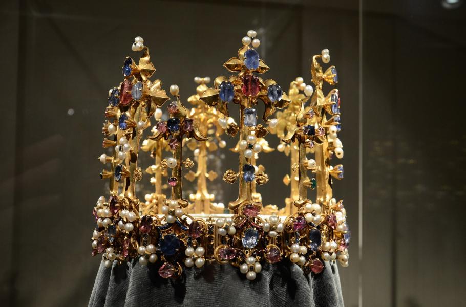 Falcká koruna se nachází v pokladnici Residenzmuseum v Mnichově. Jejím autorem byl patrně francouzský či francouzsky školený zlatník pracující v Praze. (foto: Wikimedia Commons, Soluvo, CC BY-SA 4.0)