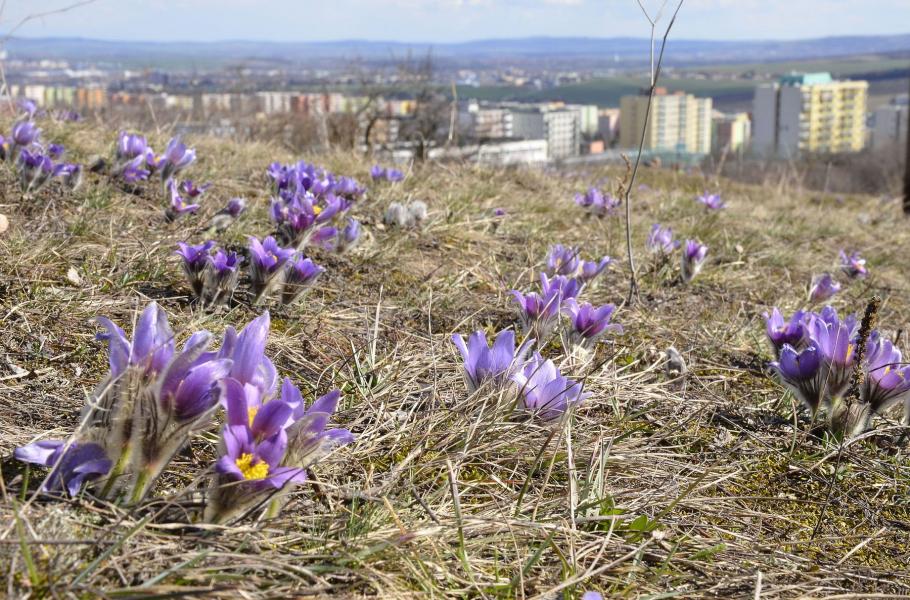 Pohled na louku Kamenného vrchu směrem na Brno s rozkvetlými konikleci velkokvětými (Pulsatilla grandis) v přírodní rezervaci Kamenný vrch v Brně. (foto: Wikimedia Commons, Linvivo, CC BY-SA 3.0)