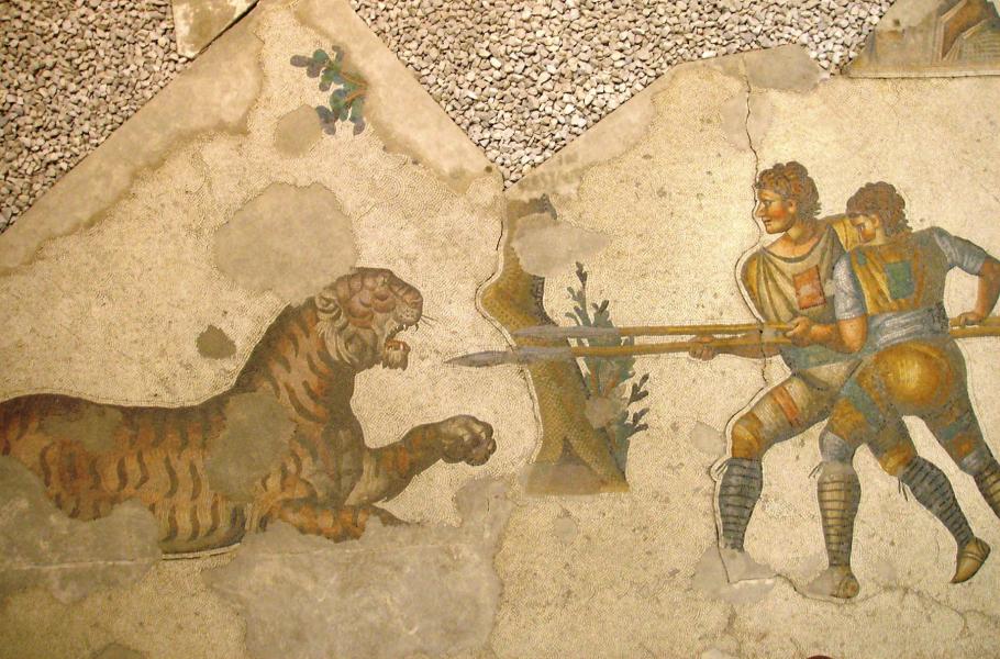 Byzantská freska z Konstantinopole, zobrazující boj gladiátorů s tygrem. (foto: Wikimedia Commons, Gryffindor, PDM 1.0)