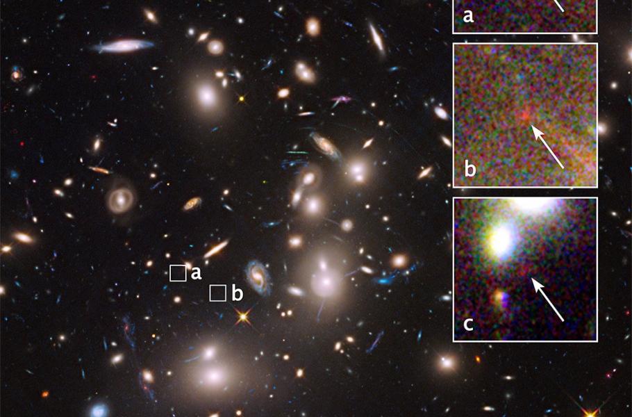 Hubbleův dalekohled a gravitační čočkování sehrály stěžejní roli i v pozoruhodném objevu letošního podzimu. Vědci v rámci programu Frontier Fields použili jako kosmické zvětšovací sklo gigantickou kupu galaxií Abell 2744 ze souhvězdí Sochaře, přezdívanou Pandořina kupa galaxií, od které nás dělí zhruba čtyři miliardy světelných let. Díky přibližně desetinásobnému zvětšení se tak podařilo odhalit jednu z nejvzdálenějších galaxií pradávného vesmíru, ležící zřejmě dál než 13 miliard světelných let. Jde o nefalšovanou fosilii o délce pouhých 850 světelných let, jejíž hmota dosahuje na galaktické poměry směšných 40 milionů sluncí.