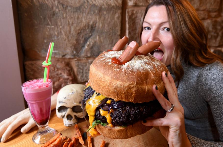 Halloweenský MegaBurger: Kdo zvládne 8 tisíc kilokalorií ve dvoukilové baště?