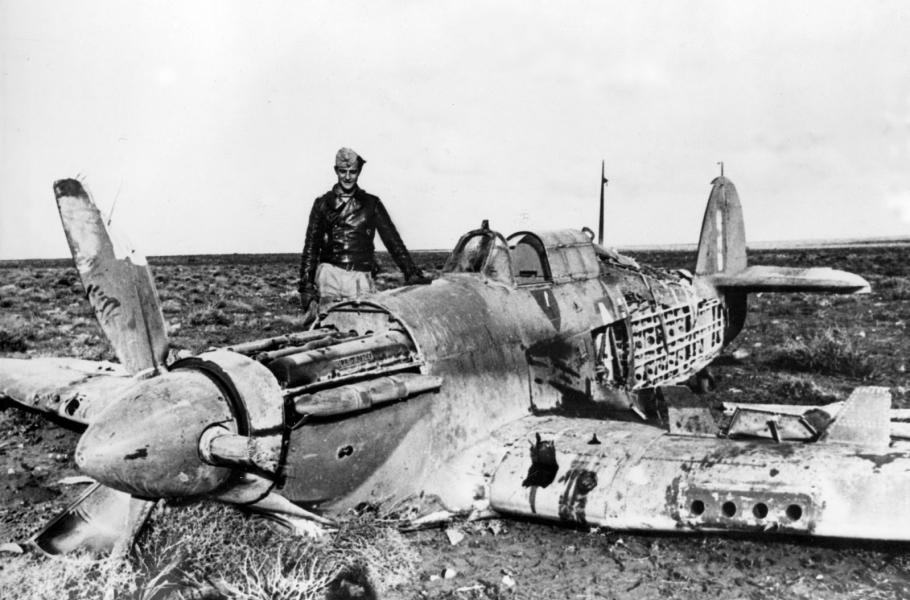 Hans-Joachim Marseille pózuje v únoru 1942 u Hawkeru Hurricanne, který sám sestřelil. (foto: Wikimedia Commons, Bundesarchiv, Oppitz, CC-BY-SA 3.0)