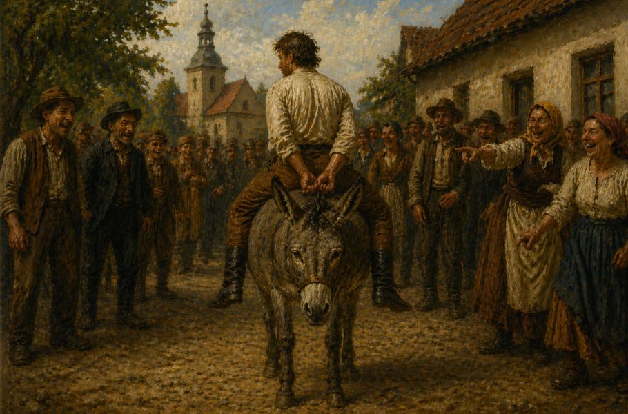 Když zákon mlčel, nastoupilo šarivari – hlučný rituál, který veřejně zesměšňoval provinilce a udržoval pořádek v komunitě. (ilustrace: ChatGPT, PDM 1.0)