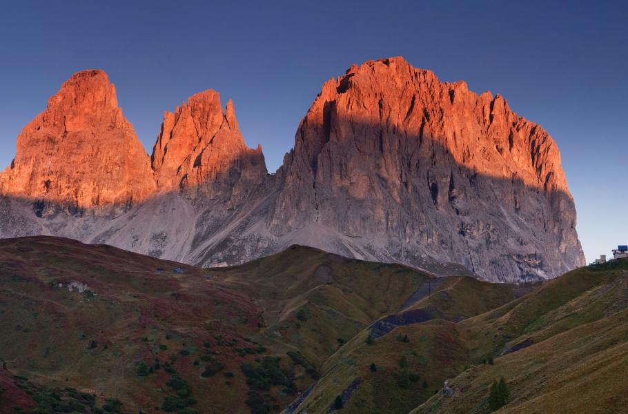 Raním sluncem nasvícené vrcholky masivu Sassolungo můžete sledovat z průsmyku Passo Sella.