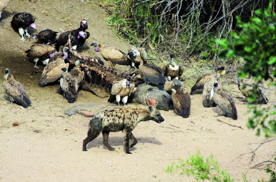 U mrtvoly (v tomto případě zdechliny nosorožce zastřeleného pytláky) je proto často k vidění obdobný obrázek. Na tělo se vrhnou hyeny, jejichž silné čelisti nemají problém ani s rozdrcením kostí. V případě, že jsou u mršiny jako první supi, před nimi nemá smečka hyen velký respekt a ihned je od těla odežene. Supi pak postávají opodál a občas „testují“, zda by je hyeny už také nenechaly urvat si svůj díl. Opovážlivce, kteří se dostali příliš blízko, ovšem hyeny nekompromisně vykazují do větší vzdálenosti. Od okamžiku, kdy jsou čtyřnozí mrchožrouti nasyceni a supi konečně mají volné pole působnosti, zbývá k úplné likvidaci zbytků masa často jen několik desítek minut.