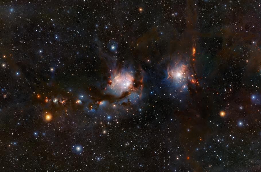 Na tomto novém snímku, který zachycuje mlhovinu M78, osvětlují mladé modrobílé hvězdy své okolí, zatímco ty sotva zrozené jen vykukují z rudě zářících zárodečných kokonů kosmického prachu.