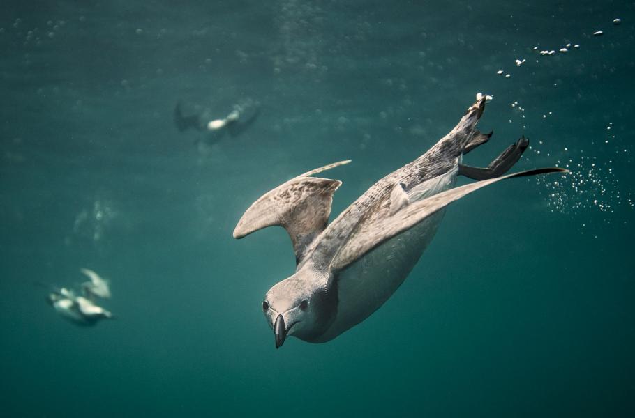 Bylo krásné ráno a na klidné hladině sedělo několik skupin alkounů úzkozobých (Uria Aalge) a alek malých. Opatrně jsem se k nim přiblížil a čekal, až se začnou potápět. Jakmile pod vodou zmizel první opeřenec, ihned jsem se i já potopil do několikametrové hloubky. Zůstal jsem nehybně „viset“ a doufal, že se některý z ptáků přiblíží na dobrou vzdálenost. Uplynuly asi dvě hodiny a já měl několik solidních záběrů alkounů. To nejlepší ale teprve mělo přijít. Proud mě odnesl o pár desítek metrů dál na moře a já se najednou ocitl uprostřed skupinky čtyř alek malých a jednoho alkouna, kteří se kolem mě začali potápět jako o život.