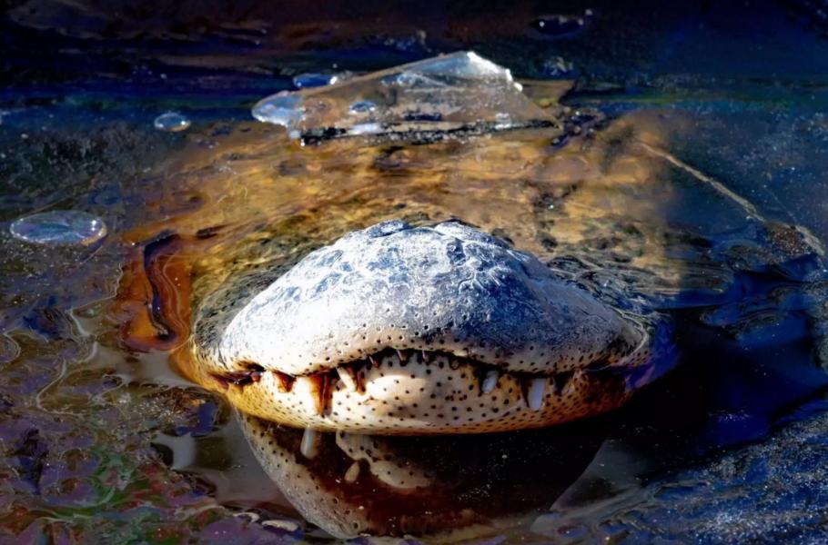 Pohled na zamrzlé čenichy aligátorů působí možná trochu děsivě, zamrzlá zvířata jsou ale v dokonalém pořádku. Díky vynořené tlamě dýchají skrz led a vydrží to až do doby, než je probudí příchod teplejšího počasí. Podobně přežívají i leguáni, které zastihl mráz na Floridě, jen při tom nejsou v ledu.