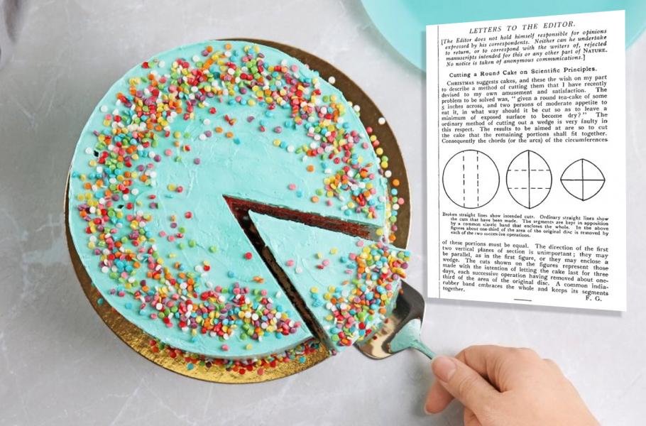 Slovutný vědec přitom řešil problém, jak zajistit, aby při krájení dortu nedocházelo k jeho zbytečnému vysychání. Pokud se totiž dort krájí obvyklým způsobem od středu k okraji, dochází k obnažení poměrně velké vnitřní plochy dortu, který pak rychleji vysychá.