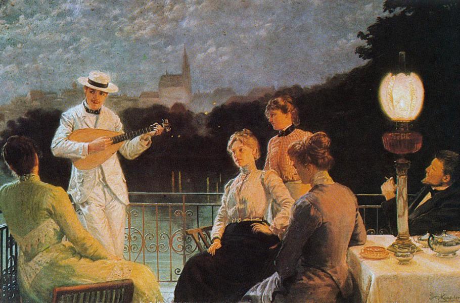 Idylické zobrazení měšťanské společnosti na obrazu Jakuba Schikanedera (1887). (ilustrace: Wikimedia Commons, PDM 1.0)