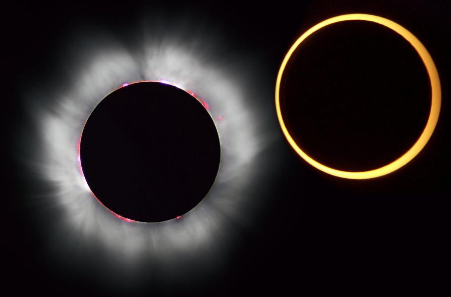 Situaci však komplikuje fakt, že Měsíc Zemi obíhá po eliptické dráze. Pokud se během úplného zatmění nachází okolo přízemí, tedy nejblíž planetě, je jeho zdánlivý rozměr větší než rozměr slunečního disku, a úplné zatmění je tak nejdelší. Nachází-li se však v odzemí, tzn. nejdál, je jeho zdánlivý rozměr menší a k zakrytí celého disku hvězdy nestačí. Z fotosféry tak kolem měsíčního disku zůstane zářící prstenec a potom mluvíme o prstencovém zatmění, při němž koróna vidět není. Jistou roli v rozlišení prstencového a úplného zatmění hraje i výstřednost dráhy Země kolem Slunce, tj. velmi málo se měnící zdánlivý rozměr naší denní stálice.