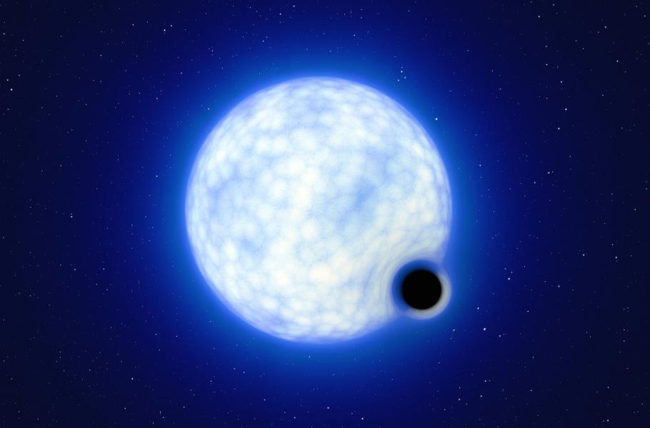 Vizualizace systému VFTS 243 - obří hvězdy 25× hmotnější než Slunce a „spící“ černé díry. Velikosti obou binárních složek nejsou v měřítku: ve skutečnosti je hvězda asi 200 000× větší než černá díra. (ilustrace: ESO, L. Calçada, CC BY-SA 4.0)