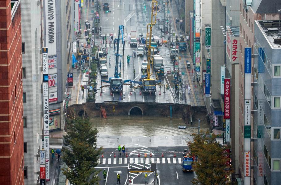 V japonském městě Fukuoka se 8. listopadu propadla část křižovatky. Kráter 30 metrů dlouhý, 27 metrů široký a 15 metrů hluboký vznikl jako následek podzemních prací při budování tunelu metra. Během pouhých sedmi dnů ale není po havárii ani památky. Jak dlouho by asi podobná oprava trvala v Česku? Sedm týdnů? Sedm měsíců? Nebo snad sedm let?