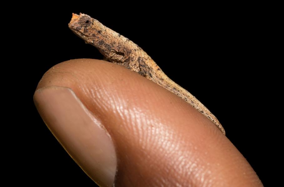 Miniaturní chameleon patří ke čtyřem druhům objeveným týmem německých biologů při noční výpravě po ostrově. Vědci hledali s pomocí svítilen živočichy, kteří se přes den ukrývají pod listy rostlin a v noci vylézají na stromy.