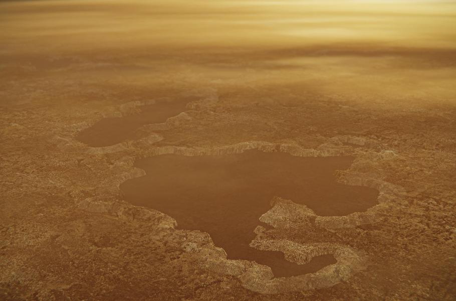 Jezero u severního pólu Titanu se strmými břehy. (ilustrace: NASA/JPL-Caltech, CC BY-SA 4.0)