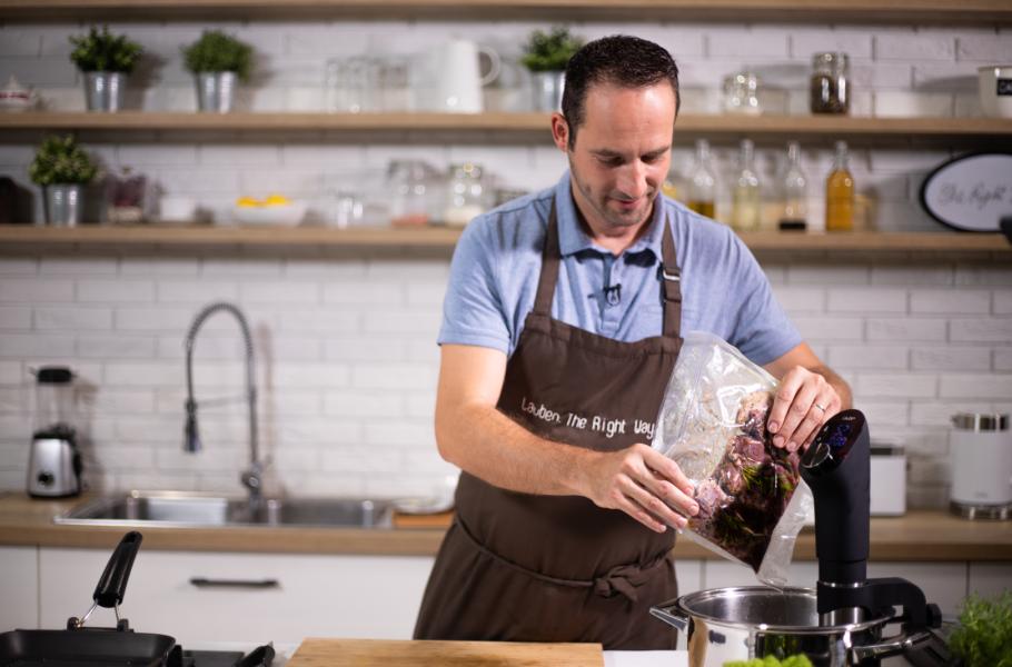 Do jakéhokoliv hrnce nalijete vodu a necháte přístroj, aby ji temperoval na doporučenou teplotu. Mezitím si připravíte jídlo do uzavíratelného sáčku. Ty jsou dodávány s přístrojem. Nebo můžete použít speciální fólii Sous Vide Foil 2805, kterou zatavíte ve vakuovačce Vacuum Sealer. Díky vakuování se odstraní nechtěné vzduchové bubliny, které by bránily symetrickému prohřátí ze všech stran. Navíc veškeré ingredience zůstanou na požadovaném místě a jejich chutě se vzájemně propojí.