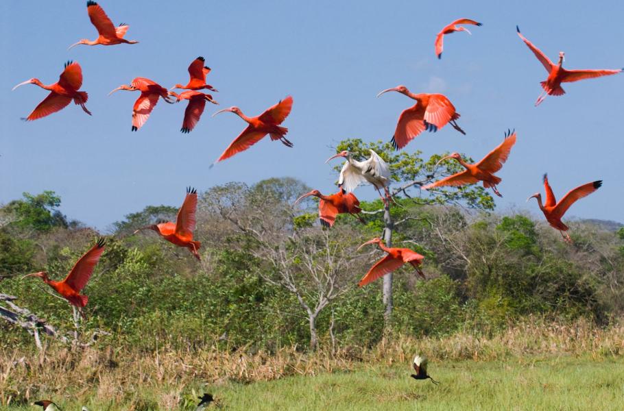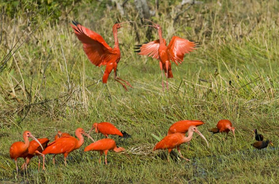 Právě v Llanos žije jeden druh, který se hluboce vtiskl do mé ornitologické duše hned od prvních dnů cest po Jižní Americe a do značné míry se pro mne stal symbolem tropické části kontinentu. Mluvím o ibisu nachovém (též ibis rudý, Eudocimus ruber), kterému kovboji v Llanos říkají corocoro colorado. Je to pták tak neobyčejný, že jsem se navzdory svému biologickému vzdělání zpočátku nemohl zbavit pocitu, že do přírody ani nepatří. Je totiž tak nápadný a nepřehlédnutelný, že si nelze neklást otázku po smyslu této podivnosti, nebo chcete-li výjimečné krásy, nad kterou se tají dech.
