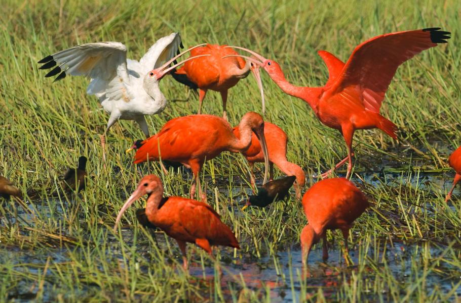 Pomalu, krok za krokem se plížíme bažinou směrem k hejnu asi třiceti rudých ibisů, v jehož středu zářivě svítí bělostný šat dvou ibisů bílých (Eudocimus albus), kteří se k hejnu připojili již včera. Během dvou či tří hodin jsme se dostali až na dvacet metrů k ptákům, kteří zcela nenuceně loví v husté podmáčené trávě. Nevěnují sebemenší pozornost ani impozantní černě zbarvené káni velké (Buteogallus urubitinga), která právě usedla na suchou větev stromu přímo nad hejnem.