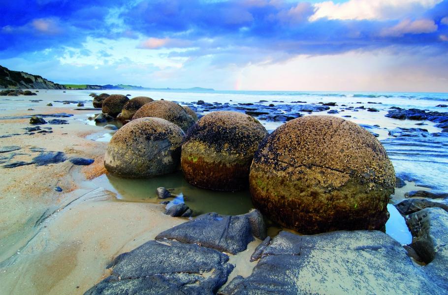 Opojeni nečekaným zážitkem dnes stíháme ještě jednu novozélandskou zajímavost – Moeraki Boulders. Obrovské balvany ležící v písku na pláži Koekohe Beach se v celé kráse odhalí jen během odlivu. Z dálky se zdá, jako by tady obři hráli kuličky a zapomněli je uklidit. Některé z téměř dokonale kulovitých balvanů mají v průměru až dva metry. Pár z nich už podlehlo erozi, ale ve vyvýšeném jílovitém břehu čekají na odhalení další a další.