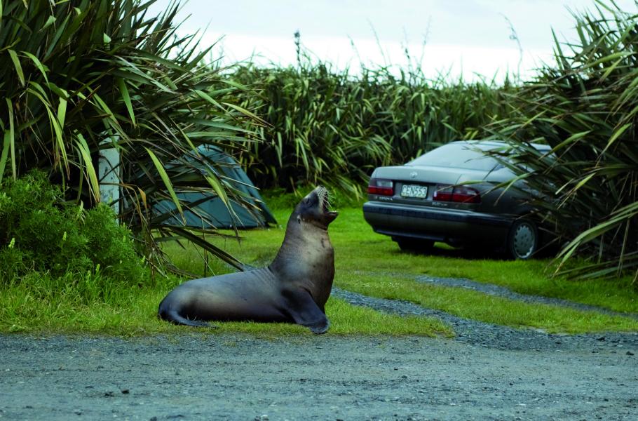Na Nugget Point zkoušíme fotografické štěstí opět následující ráno, ale podmínky nám znovu nepřejí a slunce zůstává částečně ukryté za mraky. Musíme pokračovat dál. Pobřežím odtud vedou prašné cesty, na kterých se vyhýbáme migrujícím stádům ovcí a krav. Na pláži v Cannibal Bay marně vyhlížíme lvouny (lachtan hřivnatý, Otaria flavescens), kteří by se tu měli vyhřívat po nočním lovu. Nakonec o jednoho skoro zakopneme. Leží nehybně napůl zahrabaný v písku a na první pohled vypadá jako vyplaveným kmen stromu.