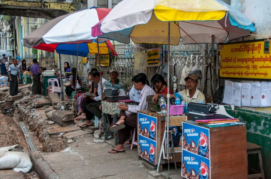 Klapání psacích strojů se nese ulicemi Rangúnu stejně jako před padesáti lety. Jedna z nejrušnějších ulic Rangúnu pořád slouží jako kancelář veřejných písařů. Stačí jim stolek, psací stůl, židlička pro zákazníka a otevřít mohou kdekoli. Nejlepší je to ale v blízkosti úřadů.