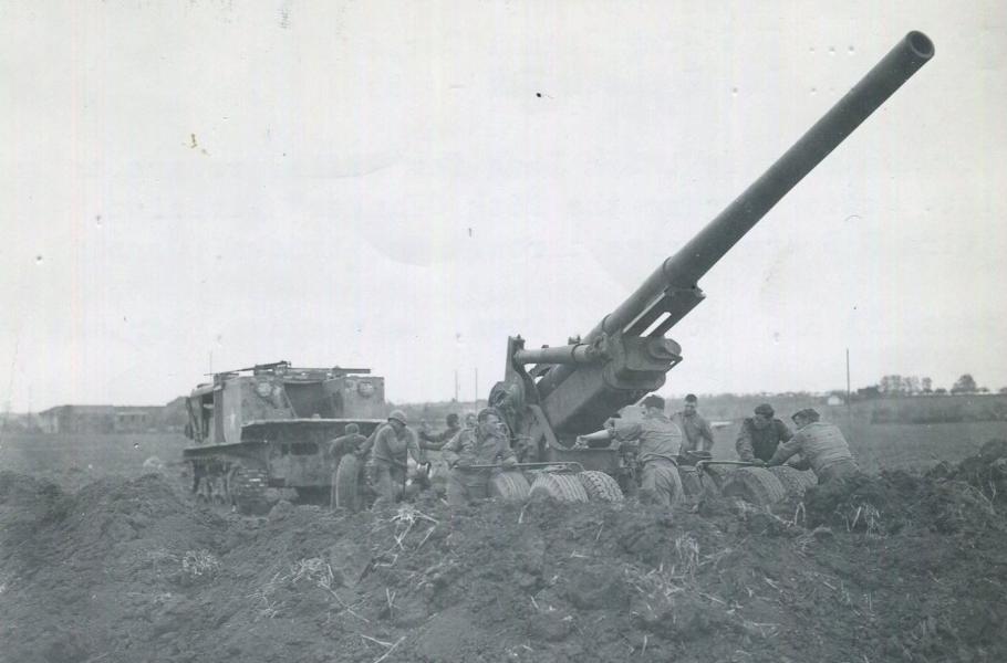 Příslušníci 244. polního dělostřeleckého praporu připravují k palbě své 150mm dělo M1A1, aby podpořili postup 26. pěší divize. Tato zbraň se pyšnila dostřelem až 22 km. (foto: Wikimedia Commons, National Archives/U.S. Army, PDM 1.0)