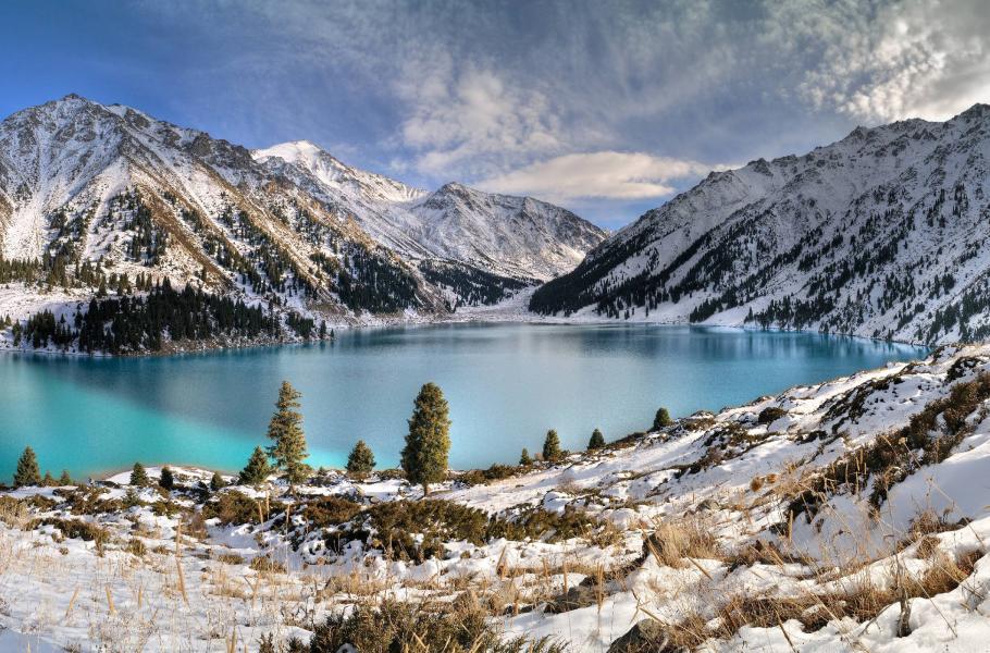 Necelých třicet kilometrů jižně od kazašského města Almaty se v soutěsce řeky Velká Almatinka rozkládá jezero Almaty. Přírodní nádrž ledovcového původu je 1,6 kilometrů dlouhá, téměř kilometr široká a 40 metrů hluboká. Jezerní zrcadlo odráží vrcholy okolních horských štítů Sovětov (4 317 m) Ozjorny (4 110 m) a Turist (3 954 m).
