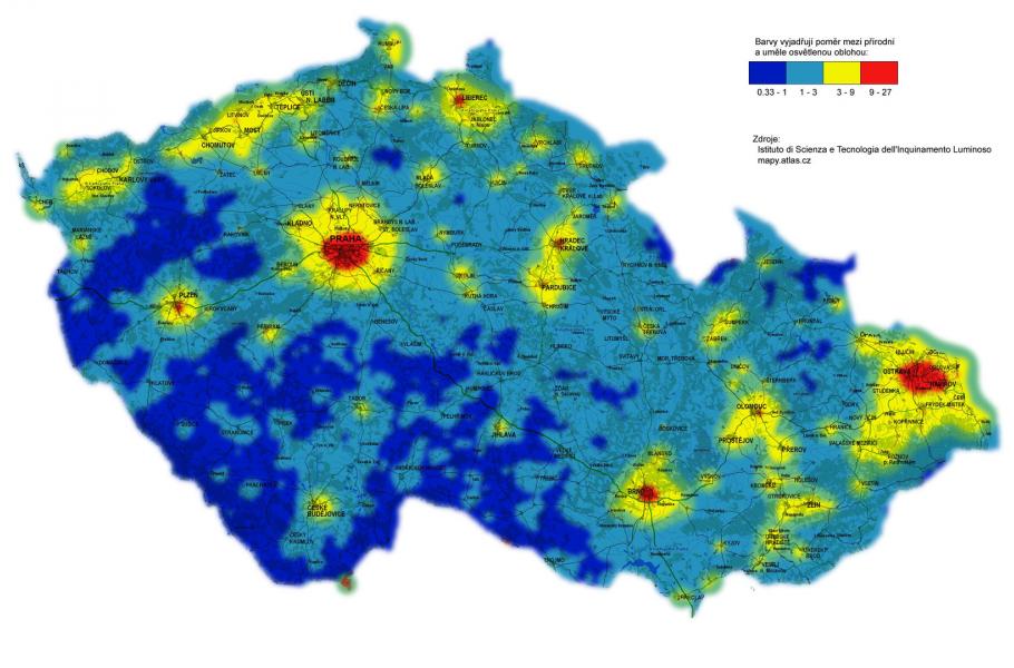 Mapa světelného znečištění v Česku. (foto: Astronomický ústav AV ČR, CC BY 4.0)