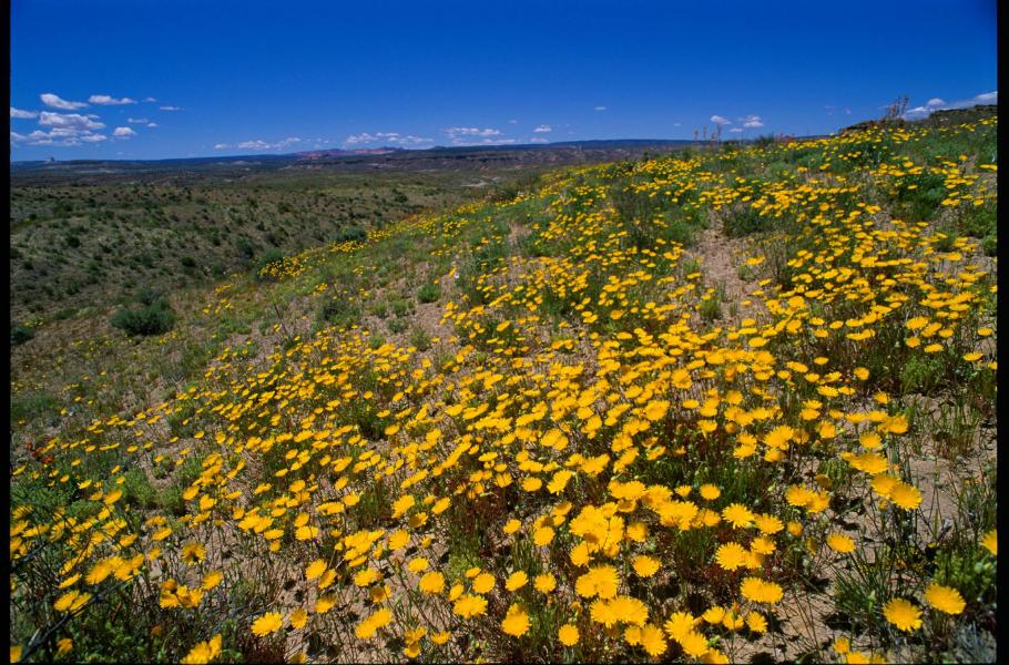 Pokračujeme v naší cestě dál na východ. S údivem sledujeme, jak se najednou poušť, kterou jsme vídávali většinou prašnou, vyprahlou a šedivou, pokryla záplavou pestrých květů – bílých, žlutých, růžových, oranžových, červených i fialových. Kvetou i kaktusy těch nejrůznějších druhů. Na severovýchodě Utahu, mezi pustinami a ostrůvky zelené trávy, vidíme stádo divokých mustangů s několika hříbaty. Jejich kopyta se topí v záplavě křehkých bílých květů. V bezpečném odstupu nás okukují tři přežvykující vidlorozi, velmi rychlé americké antilopy. Jinde si zase vyhrabává myška pilně svou díru nebo přeběhne zajíc s velkýma ušima. Poušť rozkvetla jindy utajenými zárodky života.
