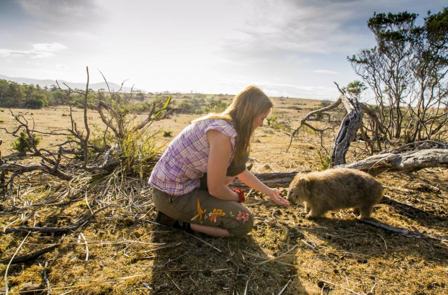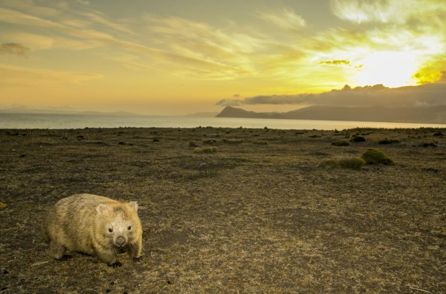 S vombatem jsme se poprvé setkali na studijní stáži v Tasmánii, kterou z velké části velkoryse financovala Přírodovědecká fakulta Jihočeské univerzity. Když jsme se na Maria Islandu, což je maličký ostrov ležící poblíž východního pobřeží Tasmánie, s tímto roztomilým stvořením setkali poprvé, všimli jsme si hned klidu, který z něj vyzařuje. Zvíře jsme zahlédli za nečekaných okolností, když jsme se na otevřeném travnatém svahu pokoušeli fotografovat klokany obrovské (Marcopus giganteus). Dobře jsme si hlídali směr větru, aby nezanesl náš pach ke klokanům a my se k nim mohli dostat co nejblíž. Když jsme se přikradli dost blízko, usadili jsme se za kmenem mrtvého stromu a věnovali se focení. Prostoru, který byl od nás po větru, jsme nevěnovali žádnou pozornost.