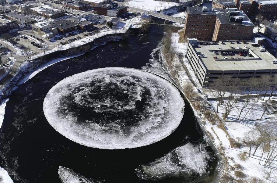 Na americké řece Presumpscot se objevil obří ledový disk. Někteří ho považují za dílo mimozemšťanů, jiní mluví o kolotoči pro kachny či o zamrzlém víru