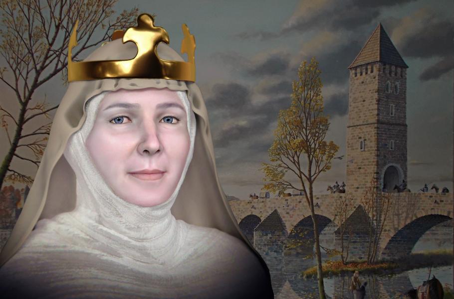 Judita Durynská – narodila se zhruba kolem roku 1135, zemřela někdy po roce 1210. Rekonstrukce podoby Judity podle kosterních pozůstatků lebky. V pozadí představa podoby Juditina mostu na obraze od Lubomíra Herce. (foto: Wikimedia Commons, Cicero Moraes, CC BY-SA 4.0)