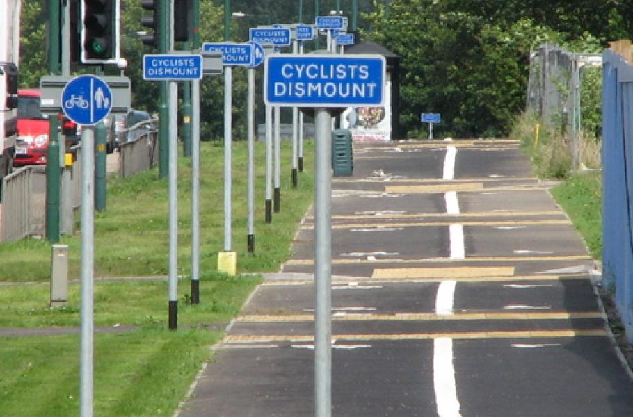 Britským Essexem vede řada cyklostezek, po nichž mohou jezdci na kolech pohodlně cestovat téměř kamkoliv, aniž by se museli proplétat silniční dopravou. Správa hrabství si nicméně vzala do hlavy, že je třeba dbát také na bezpečí případných chodců, a to i na frekventovaných trasách pro bicykly. Ve čtvrti Temple Fields v městečku Harlow tak vznikl cyklistický úsek, kde musejí dát „kolaři“ přednost pěším a sesednout. Na první pohled nijak neobvyklý úkon je však třeba na trase dlouhé necelých 350 m vykonat podle značek celkem sedmkrát: Cyklista se tudíž nestihne ani pořádně rozjet, a už zase brzdí. Není divu, že nařízení nikdo nedodržuje a město zvažuje jeho „opravu“.