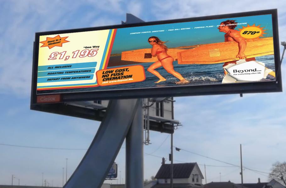 „Bolí vás hlava? Kašlete a máte zimnici? Raději byste měli sepsat poslední vůli!“ hlásá jeden z plakátů pohřební služby Beyond.Life neboli „onen svět“. Její daleko hravější reklama pak zachycuje mladý pár běžící po pláži, který má ovšem místo surfových prken víka od rakví. V tomto případě společnost nabízí „jednosměrný výlet do spalujících tropů“, čímž odkazuje ke kremaci.