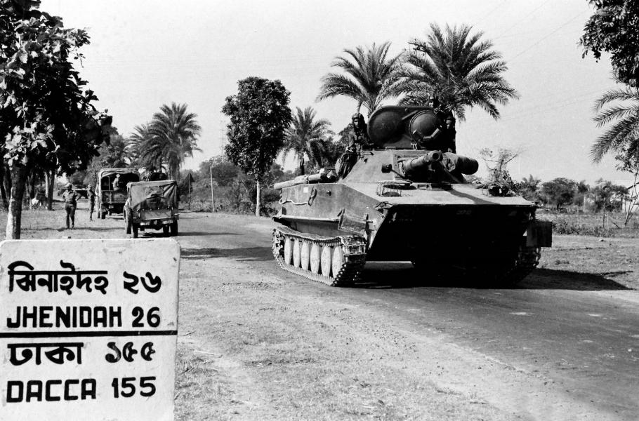 Indické PT-76 míří k Dháce. Lehký obrněnec se schopností plavat se skvěle hodil pro boj na území protkaném mohutnými vodními toky. (foto: Wikimedia Commons, CC BY 4.0)