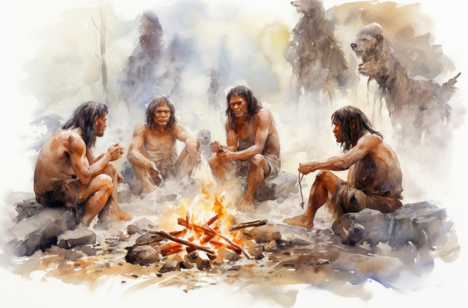 Ohniště z portugalské jeskyně Gruta de Oliveira prozrazují, že neandertálci ovládali oheň, a že byl ústřední součástí jejich každodenního života. (ilustrace: Midjourney AI, PDM 1.0)