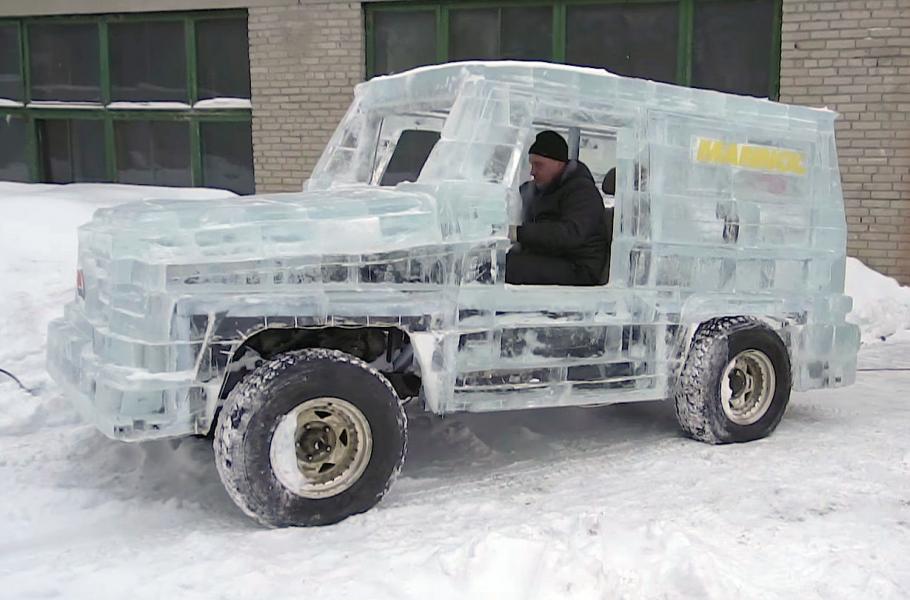 Nejde ale jen o nějakou obyčejnou ledovou sochu, ledové bloky tento motoristický nadšenec z Novosibirska namontoval na odstrojený vojenský UAZ 469. Ledový Mercedes třídy G je tak plně funkční. Do ruského počasí nepochybně autíčko k pohledání…